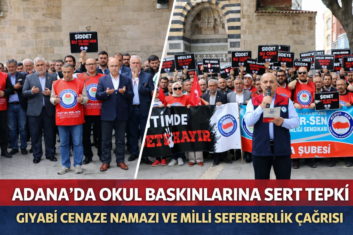Kahramanmaraş ve Şanlıurfa’da yaşanan okul baskınlarına tepki gösteren Memur-Sen ile Eğitim-Bir-Sen Adana Şubesi, cuma namazı sonrasında Adana Ulu Camii önünde gıyabi cenaze namazı kıldı ve basın açıklaması gerçekleştirdi.
