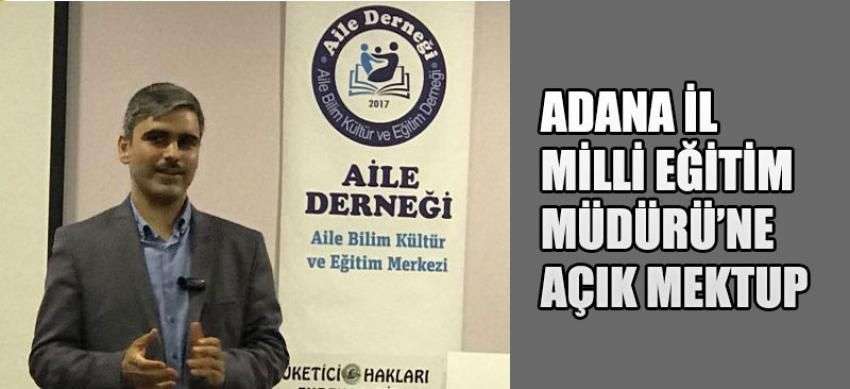 Aile bilim kültür ve eğitim derneği baskanı adnan kalkan bir haber sitesinde yayınlanan köşe yazısında "Adana Milli Eğitim il Müdürü Mustafa Altınsoy'a Açık Mektup" başlıklı bir yazı kaleme aldı.