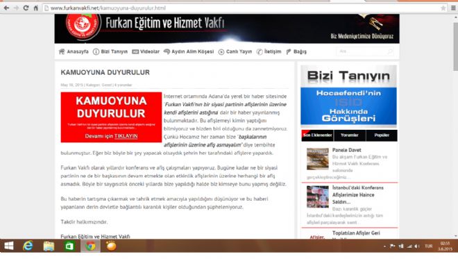 Hiçbir şekilde kendilerini hedef almadığımız ve iki kurum arasında çıkabilecek büyük bir tartışmayı ve kavgayı önlemek niyeti ile yaptığımız haberle ilgili olarak Furkan Vakfından yapılan açıklamada sitemiz yöneticileri "Derin Devlet ile bağlantılı Karanlık kişiler" olarak tanımlandı.